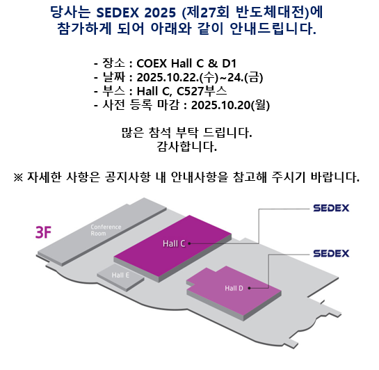 당사의 SEDEX 2025 (제 27회 반도체대전) 참가 안내 드립니다.- 장소 : COEX Hall C & D1- 날짜 : 2025.10.22.(수)~24.(금)- 부스 위치 : Hall C, C527부스 ...